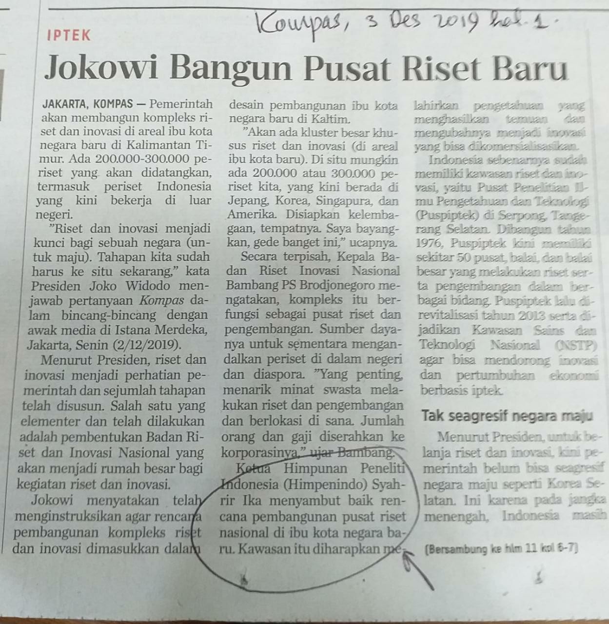 Ketua Himpunan Peneliti Indonesia (Himpenindo) Syahrir Ika menyambut baik rencana pembangunan pusat riset nasional di ibu kota negara baru. Kawasan itu diharapkan melahirkan pengetahuan yang menghasilkan temuan dan mengubahnya menjadi inovasi yang bisa dikomersialisasikan.