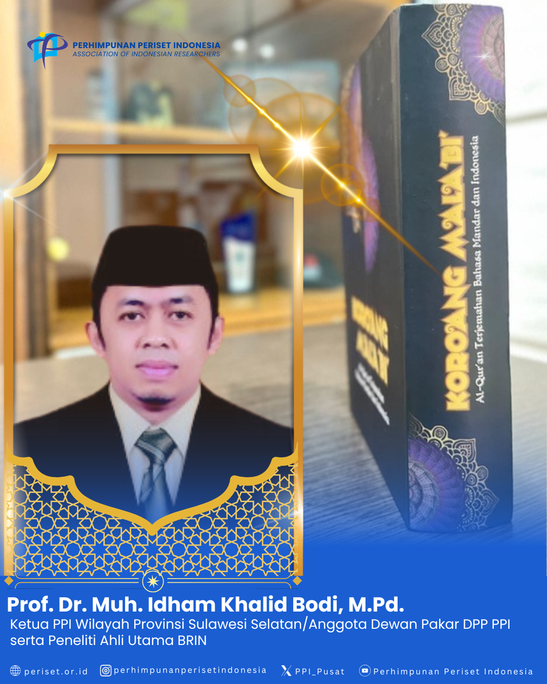 Perhimpunan Periset Indonesia mengucapkan selamat dan sukses kepada Prof. Dr. Muh. Idham Khalid Bodi, M.Pd., Anggota Dewan Pakar DPP PPI sekaligus Peneliti Ahli Utama BRIN, atas terbitnya buku Koro’ang Mala’bi’ - terjemah Al-Qur’an dalam bahasa Mandar dan Indonesia.